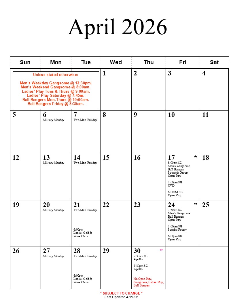 Please click here to book a tee time. All fees are charged upon check-in at the Golf Shop.